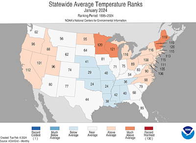 The warmest areas, relative to average, were the Northeast, Great Lakes region, and parts of California. It's interesting that only one state - Wisconsin - had one of their top ten warmest January on record.